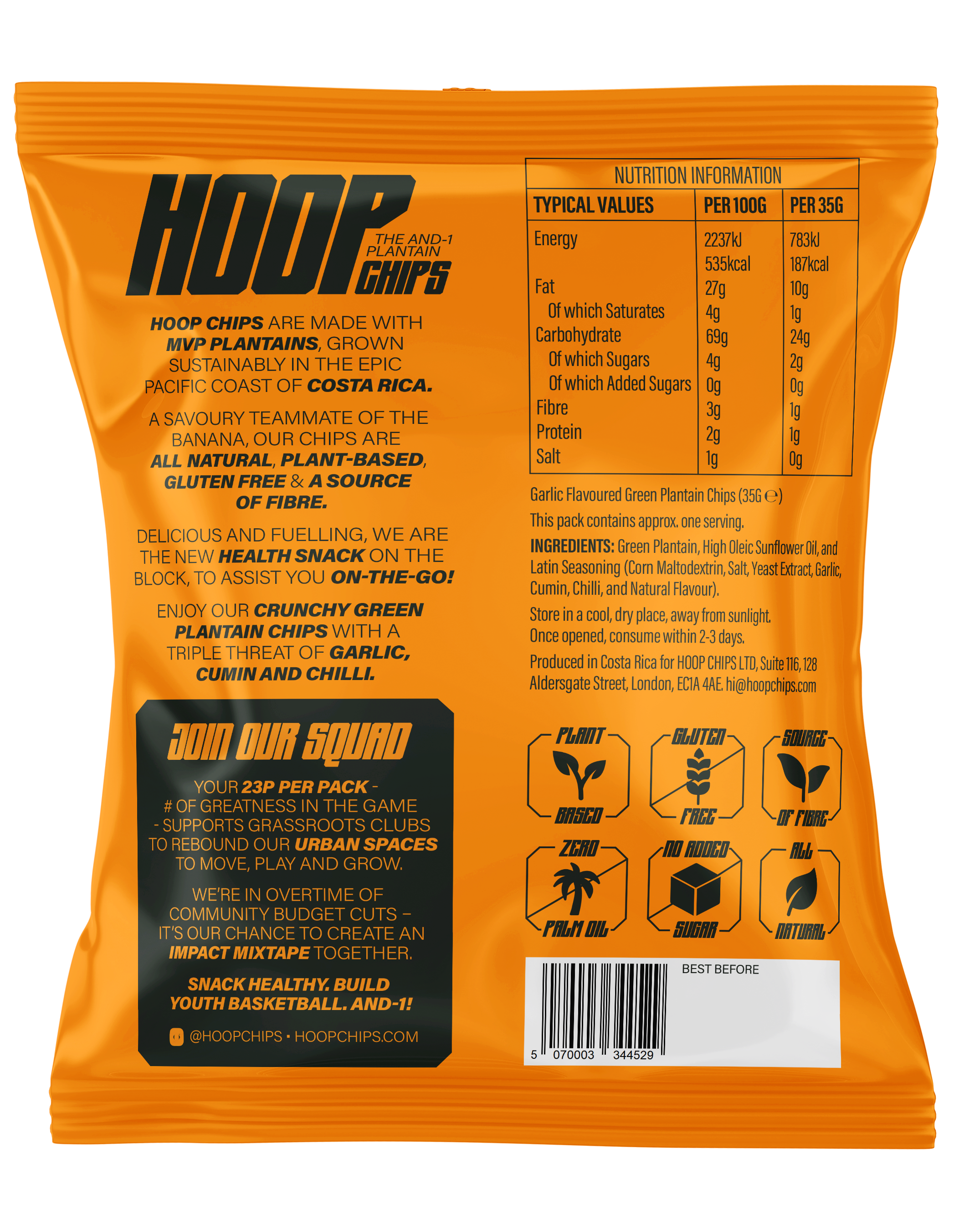 ENJOY OUR CRUNCHY GREEN PLANTAIN CHIPS WITH A TRIPLE THREAT OF GARLIC, CUMIN AND CHILLI.